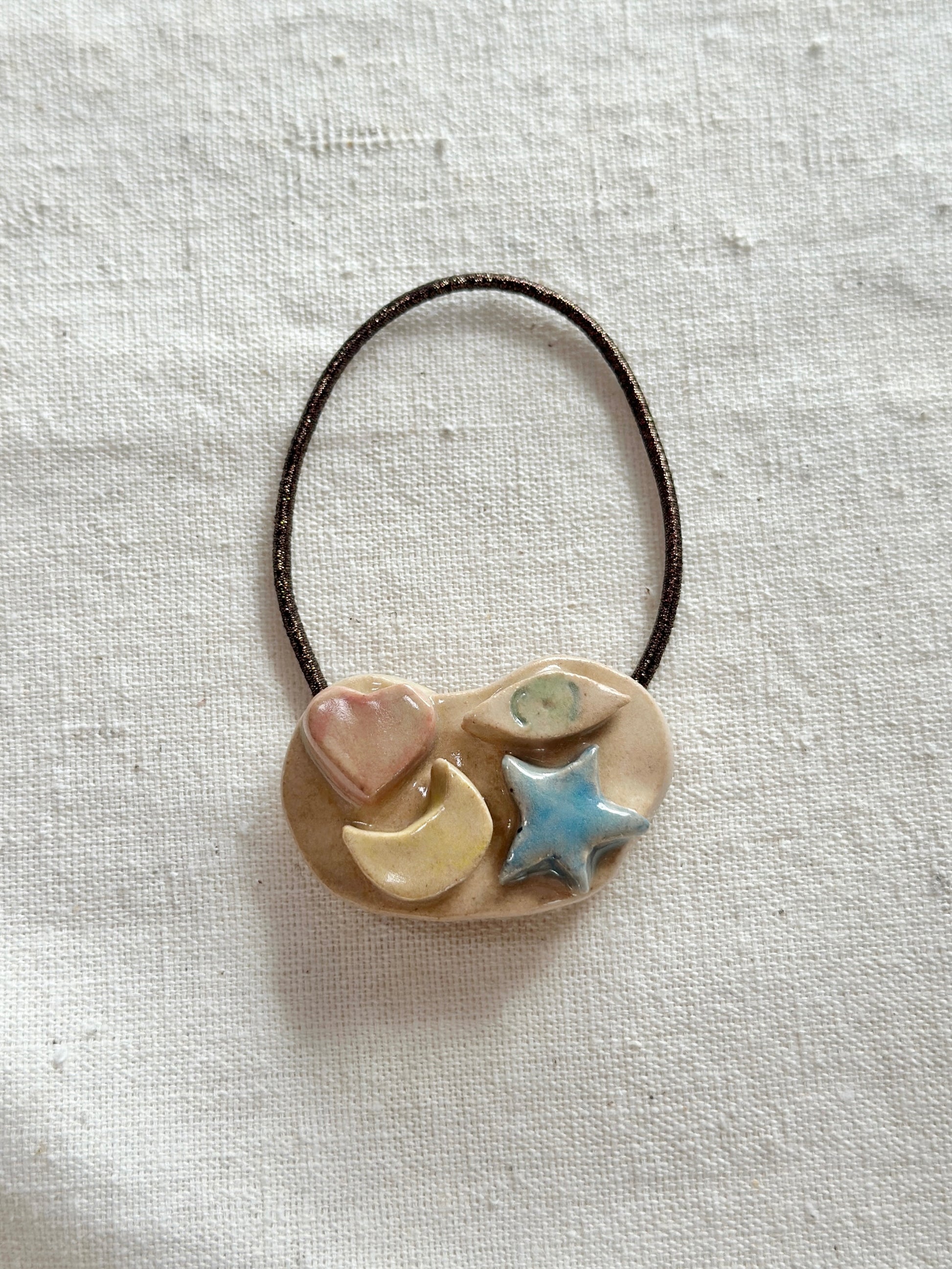 These hair ties feature ceramic decorations. Each one is handmade and unique.